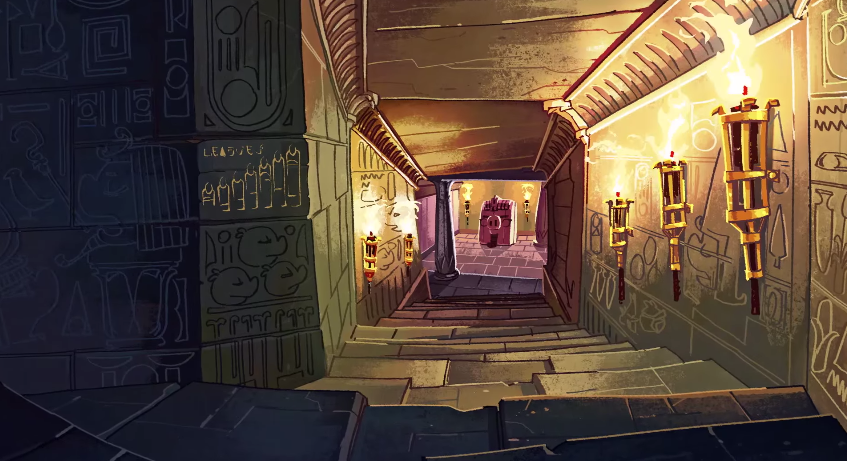 Entering the ruin, you continue down a long corridor covered in crude glyphs. Torches line the wall. How are these still lit? This place must have been sealed for hundreds -no, thousands of years before you arrived. Eventually you find yourself in an opulent burial chamber. A great sarcophagus occupies a central position, and scattered about the room are piles of what appear to be golden –eggs? You could swear you smell bacon. You brush centuries of dust and sand from the engravings on the face of the stone receptacle. These markings… they’re indecipherable.