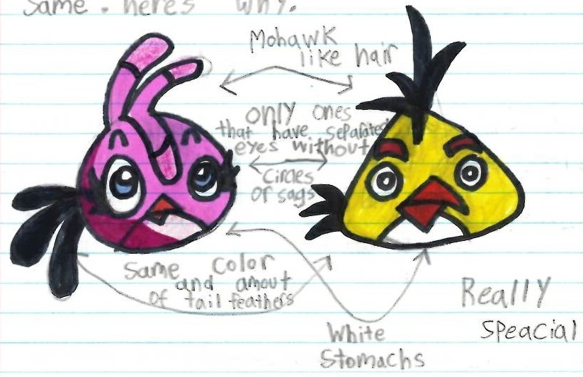 First thing’s first, cool drawings! Hmm… Mohawk-like hair, check. Similar eyes, check. Similar tailfeathers, check. Similar stomachs, check. There are some interesting similarities there James! Their personalities are similar in some ways too, but I don’t know if Chuck’s scatterbrainedness would go over too well with Stella. There are even some that would say “opposites attract”. Plus they live on different islands, so there’s that – but could they be long-lost siblings?! Gasp!! Naw, I just made that up. …Or did I? No, definitely made up.
